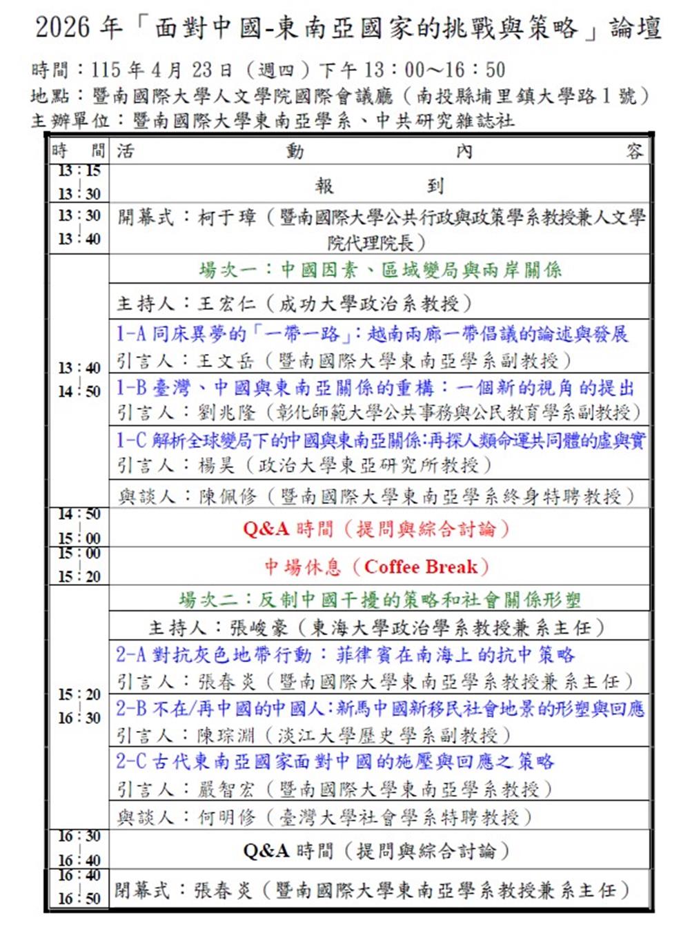 115年4月23日:2026年「面對中國-東南亞國家的挑戰與策略」